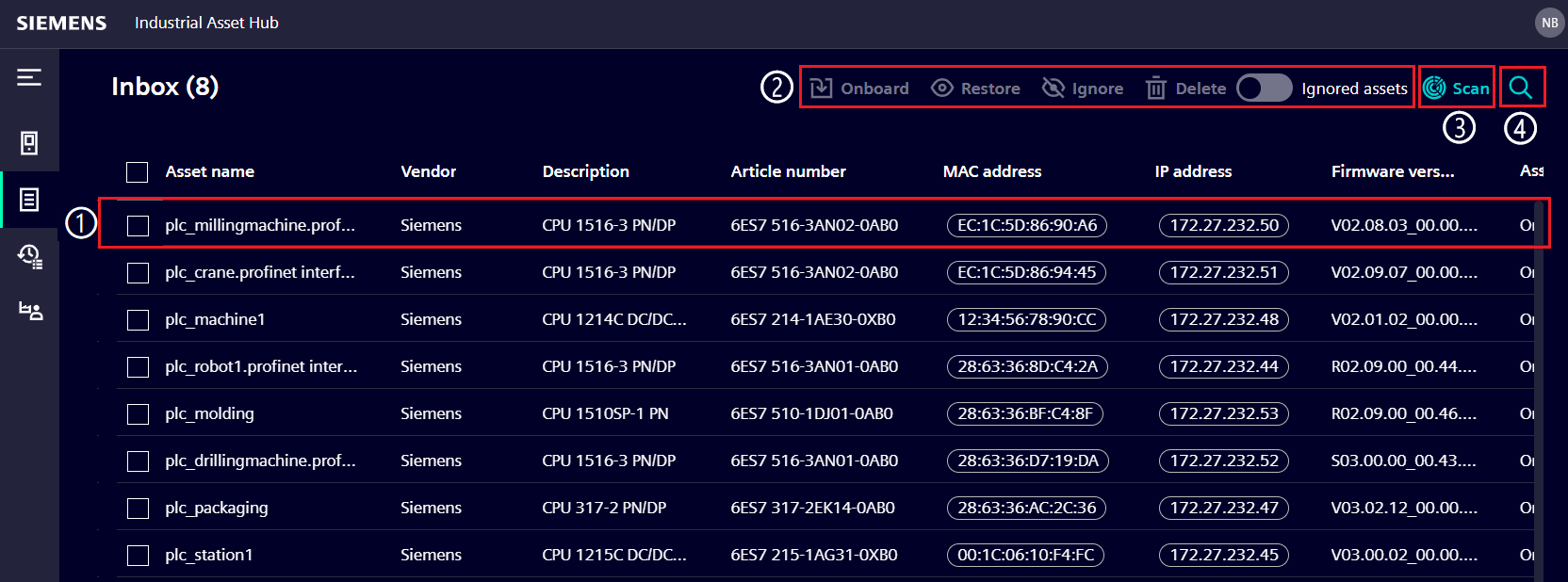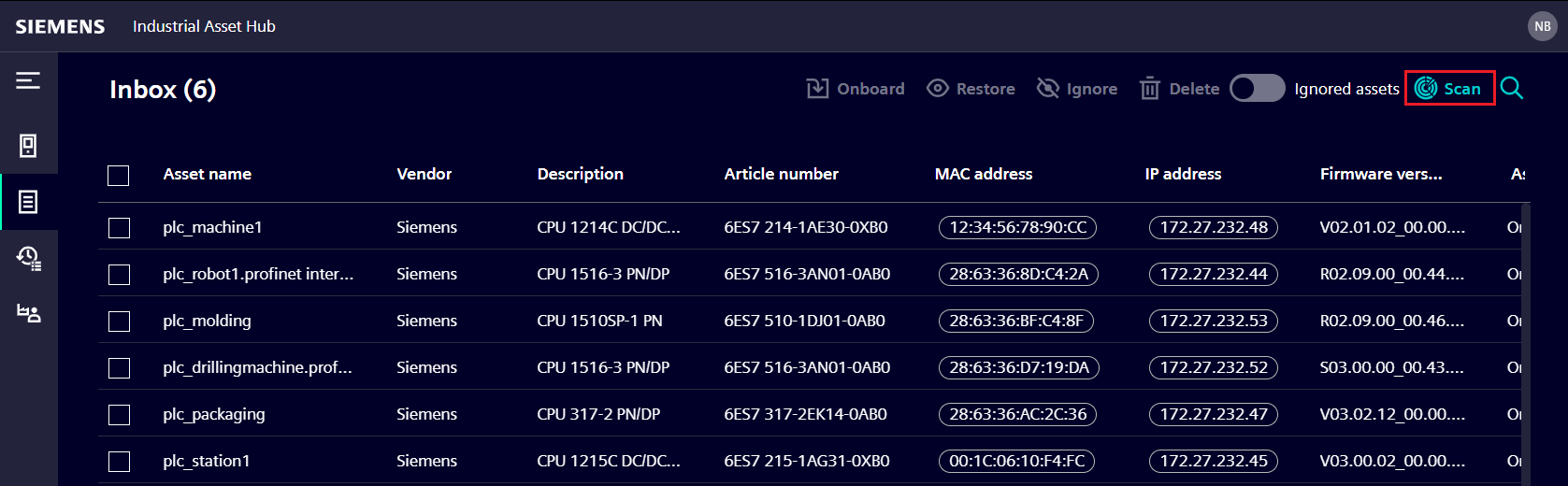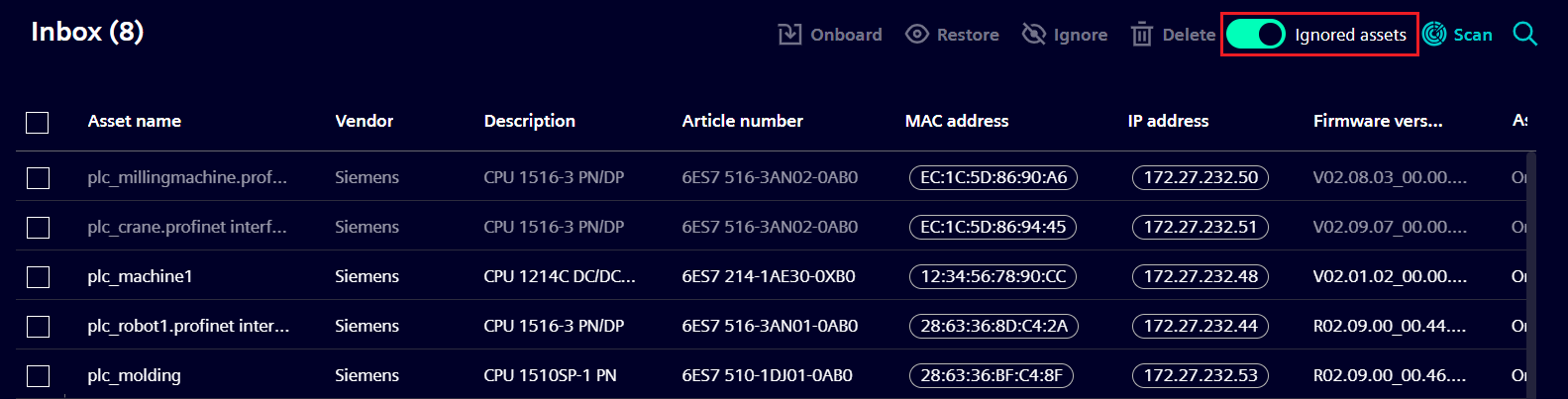 All scanned, ignored and not onboarded assets are shown on the Inbox page.