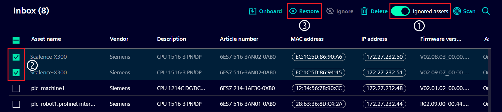 Figure: Inbox with selected ignored assets to be restored